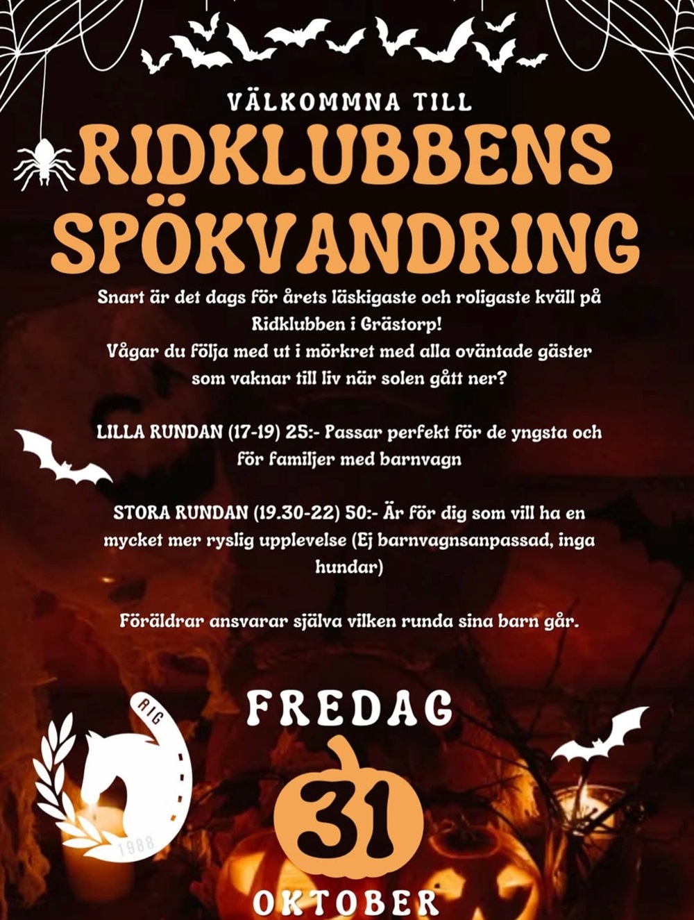 Då ska du komma till läktaren i ridhuset den 25 oktober kl.10.30-12.00 för planering av årets spökvandring 2025!