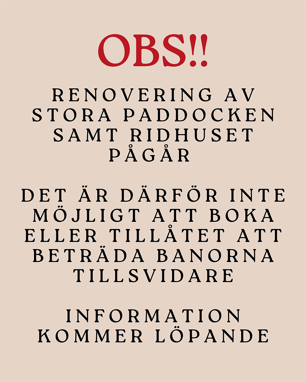 DET ÄR DÄRFÖR INTE MÖJLIGT ATT BOKA ELLER TILLÅTET ATT BETRÄDA BANAN/RIDHUSET MEDAN ARBETE PÅGÅR.